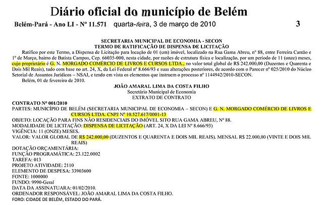 Cliquem em cima das imagens, para facilitar a leitura das publicações no Diário Oficial de Belém. Vejam que, sem licitação, Gervásio Morgado recebe por ano só nesse contrato com a Prefeitura – com a qual é constitucional e legalmente impedido de contratar - R$275.865,84, tudo tirado do meu, do seu, do nosso dinheirinho, que falta para salvar vidas e sobra para a corrupção.